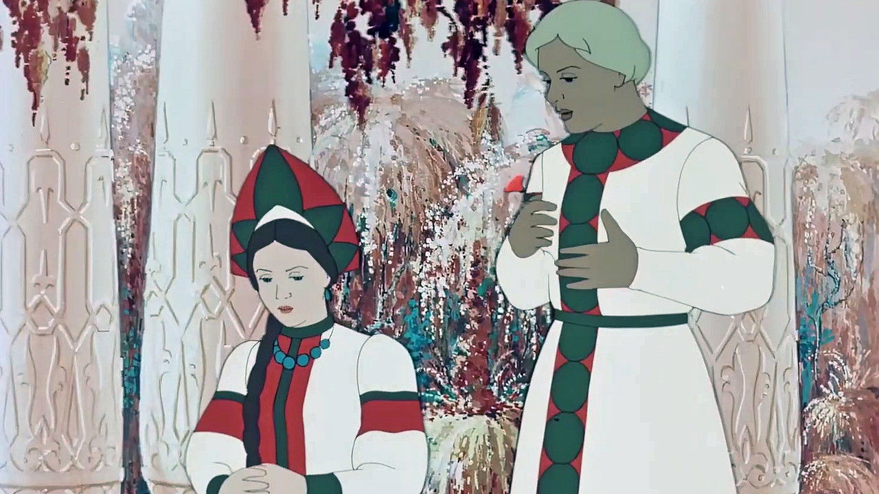Before going on an overseas journey, a merchant father asks his three daughters what they would like him to bring back for them. The eldest asks for a shining tiara, the middle asks for a frame through which her face would always appear young, and the youngest (Nastenka) asks her father to bring her a beautiful scarlet flower like one which she saw in her dreams. Her elder sisters laugh at this simple wish. The father's trip is successful and he finds everything that he came for, with the exception of Nastenka's scarlet flower. Nevertheless, the ship heaves off and they begin to head back while the father scans the lands around him for a scarlet flower.